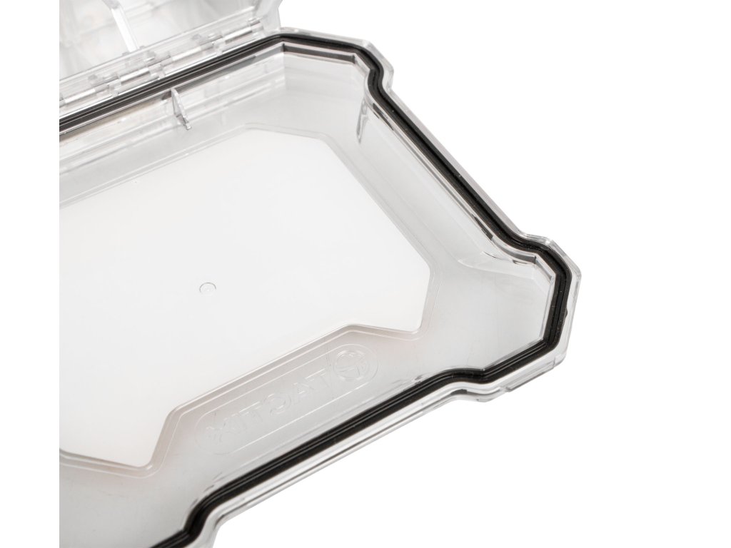 Vodotěsný plastový organizér, 6 odnímatelných přihrádek. Rozměr 18 x 16,5 x 5,2 cm.