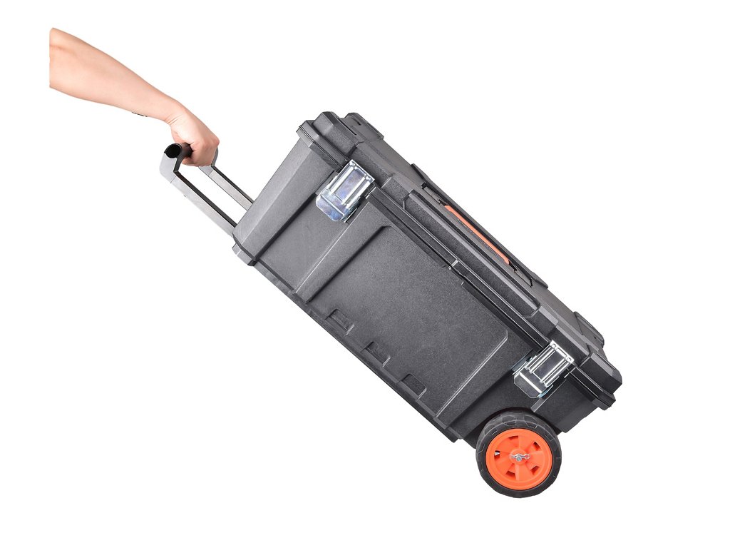 Pro přesun je box vybavený jedním plastovým, jedním kovovým madlem a kolečky.