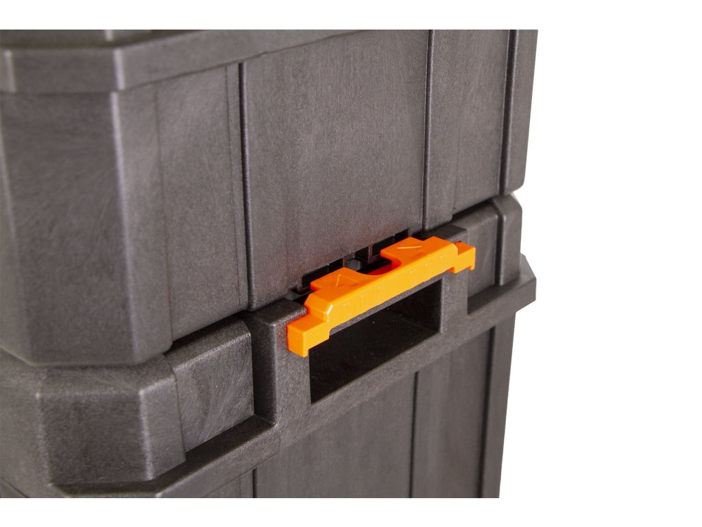 Lze jej stohovat například s modely TC320361 a TC320365, čímž lze rozšířit úložný prostor. Díky pevné plastové konstrukci je odolný vůči nárazům a opotřebení.