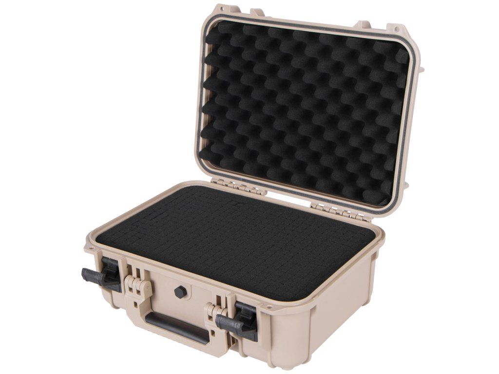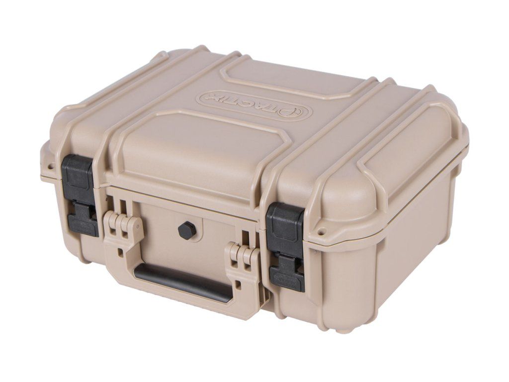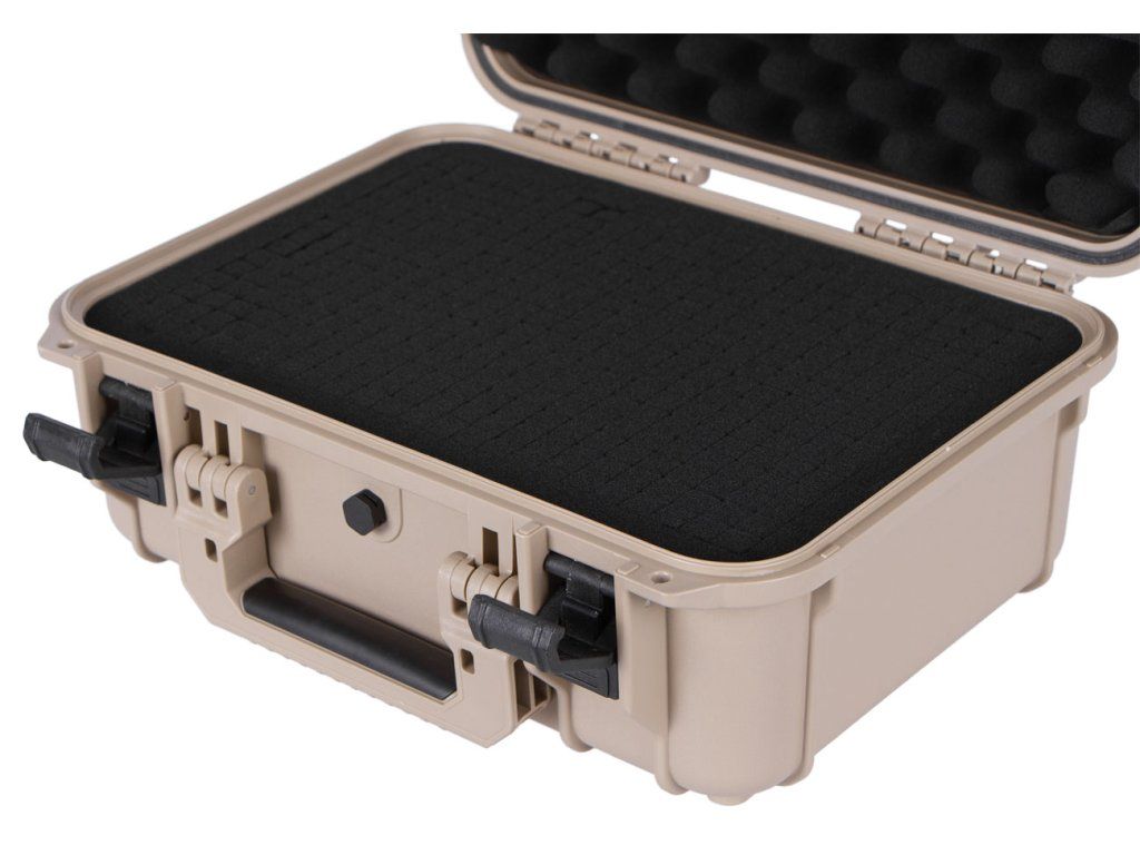 Vodotěsný plastový kufr v pískové barvě, pro různé druhy křehkého nářadí a vybavení.