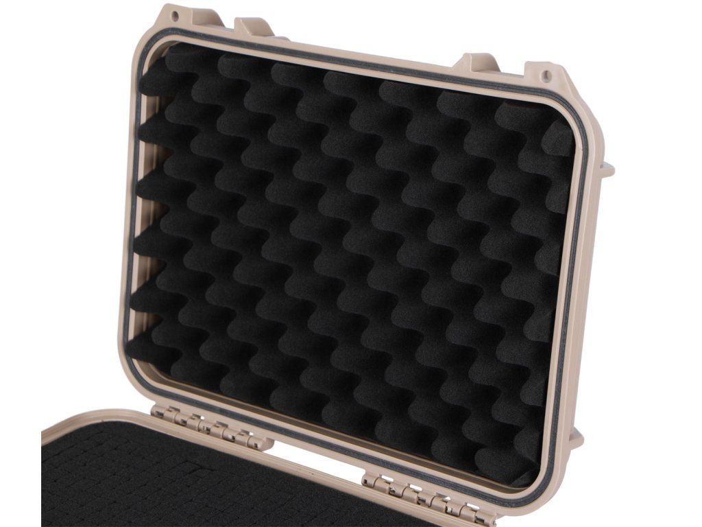 Vodotěsný plastový kufr s předřezanou pěnovou výplní. IP65, pískové provedení, rozměry: 415 x 325 x 182 mm.