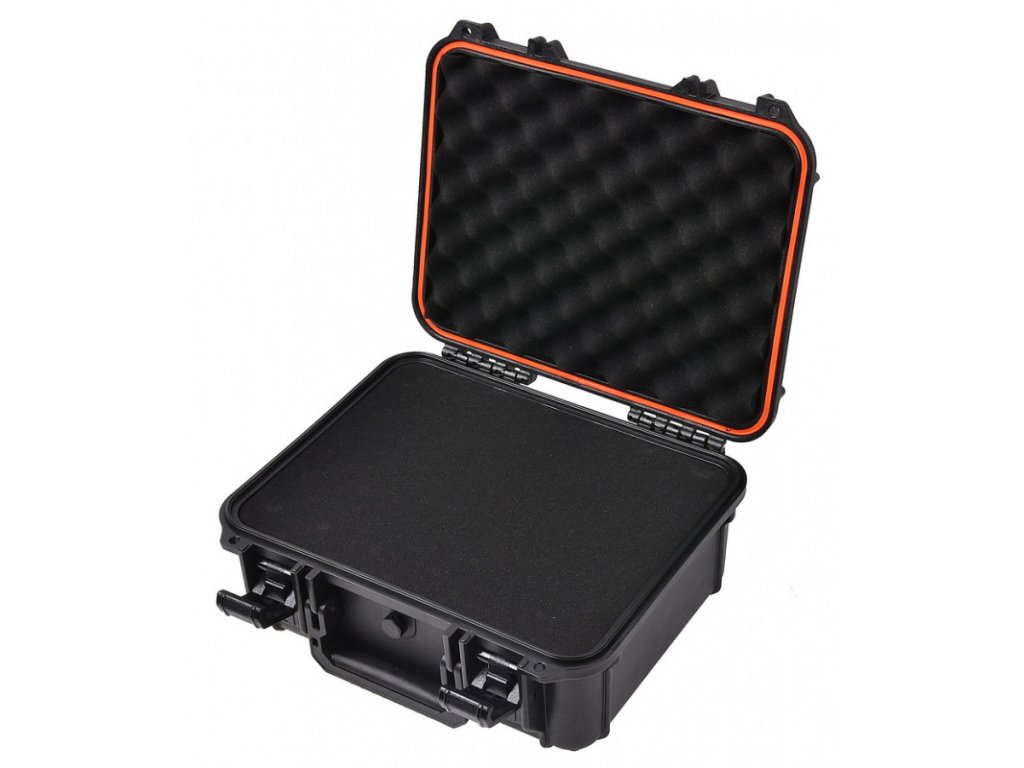 Vodotěsný plastový kufr s předřezanou pěnovou výplní. Rozměry: 345 x 295 x 154 mm.