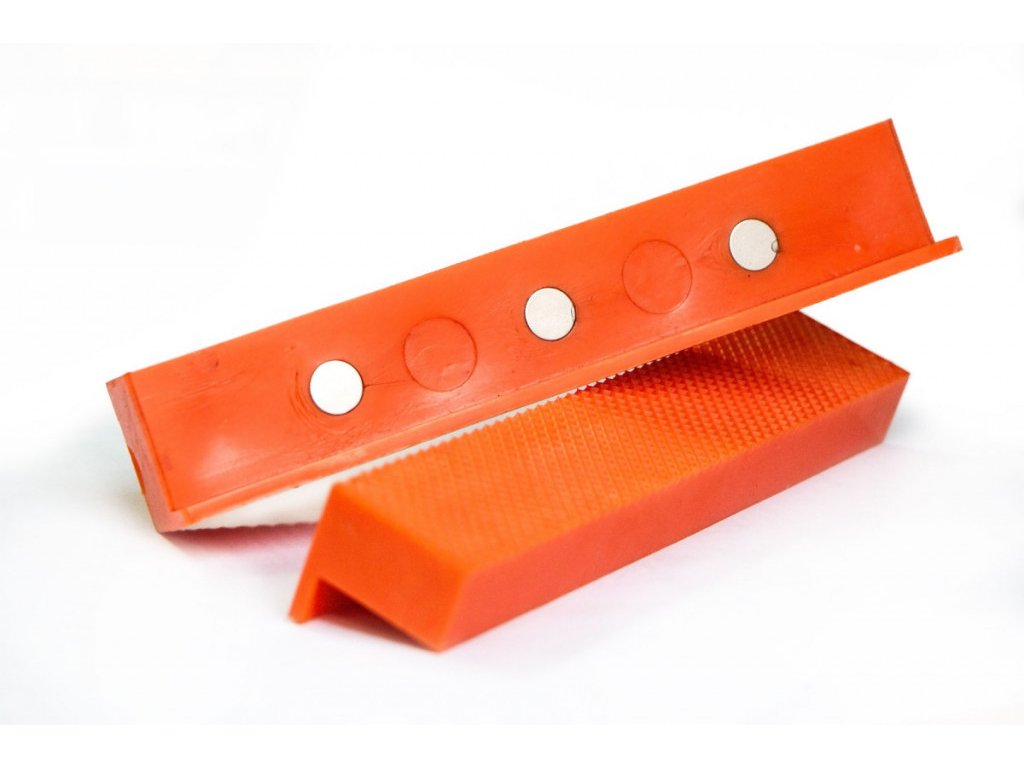 Vroubkované magnetické čelisti pro uchycení výrobků bez poškození. Rozměry 157×28×25mm. Dodáváme jako pár (2 ks).