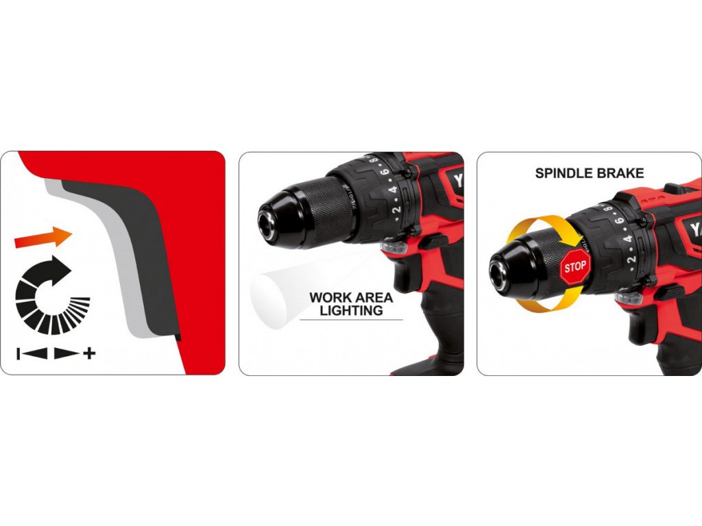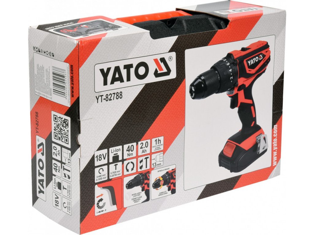 Profesionální AKU příklepová vrtačka YATO o síle 18V (max. otáček 1650 za minutu) s vysoce kvalitním, profesionálním pohonem japonské značky Mabuchi Motor Co. Ltd.