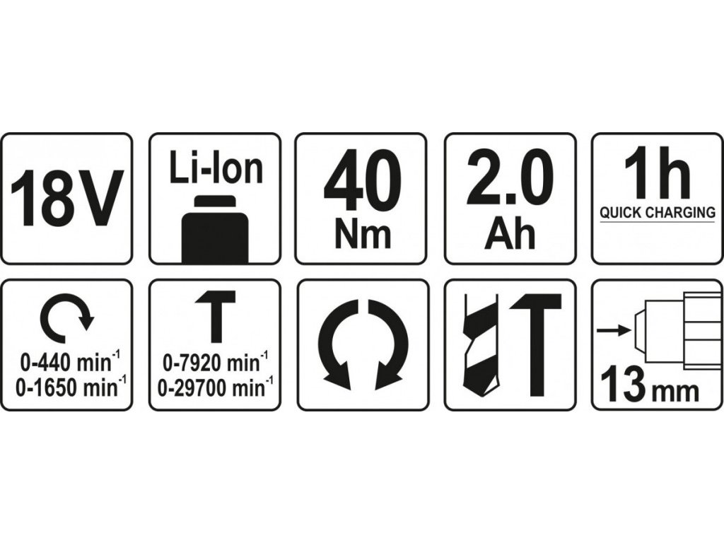 Vrtačka/šroubovák má dva rychlostní stupně: 0 až 440 otáček s až 7920 příklepy a 0 až 1650 otáček/minutu s až 29700 příklepů/minutu. Dále oboustranný chod a maximální krouticí moment 40 Nm.