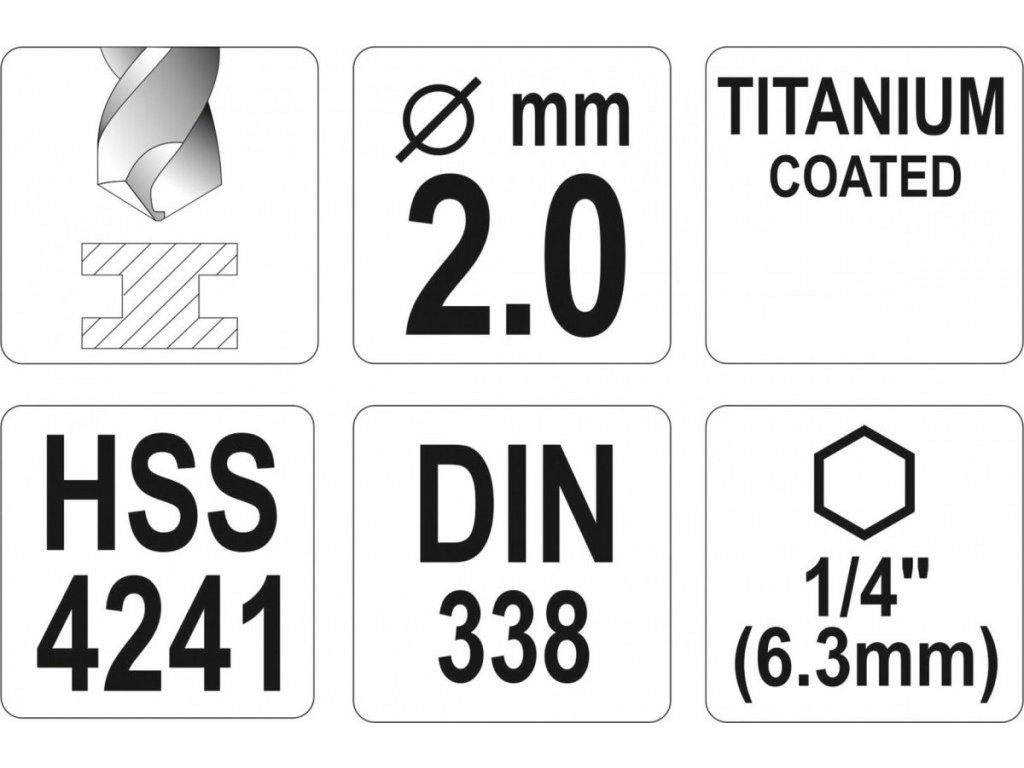 Vrták na kov 2mm TITAN HEX 1/4", délka 72mm - YT-44751