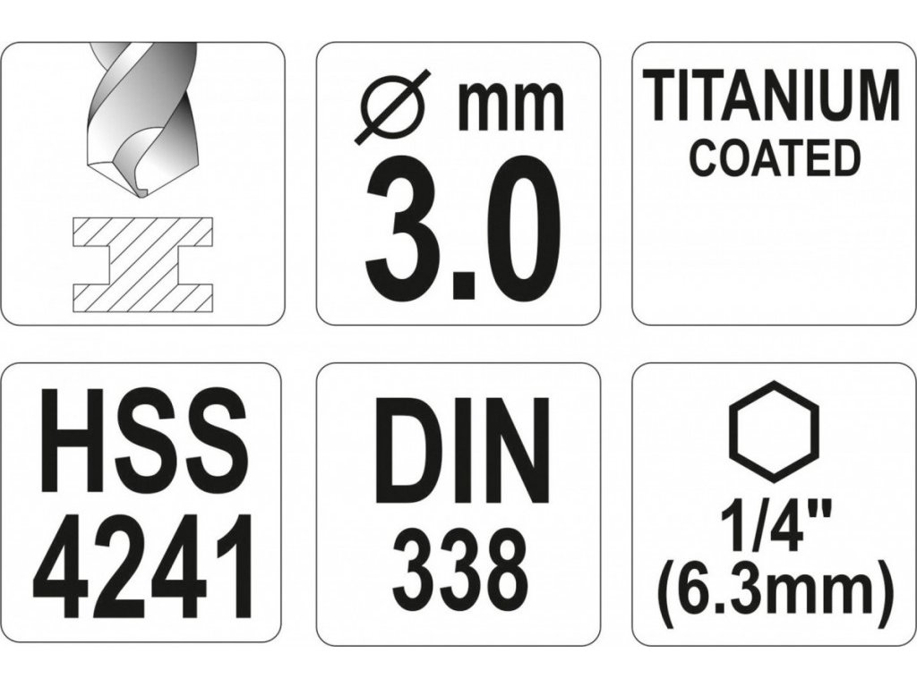Vrták na kov 3mm TITAN HEX 1/4", délka 81mm - YT-44754