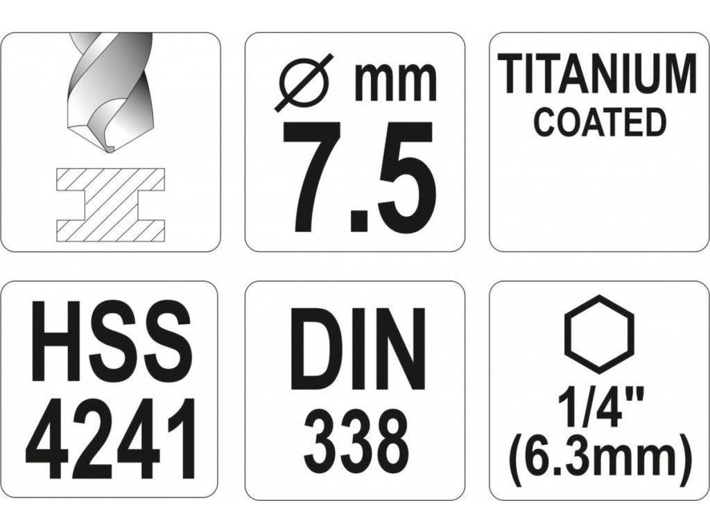 Vrták na kov 7,5mm TITAN HEX 1/4", délka 109mm - YT-44767