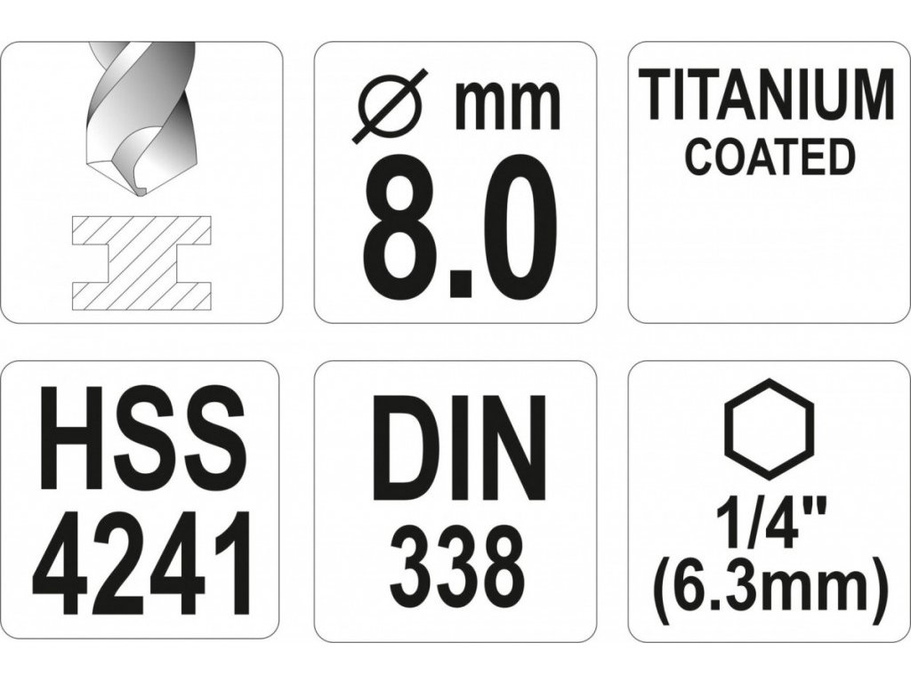 Vrták na kov 8mm TITAN HEX 1/4", délka 117mm - YT-44768