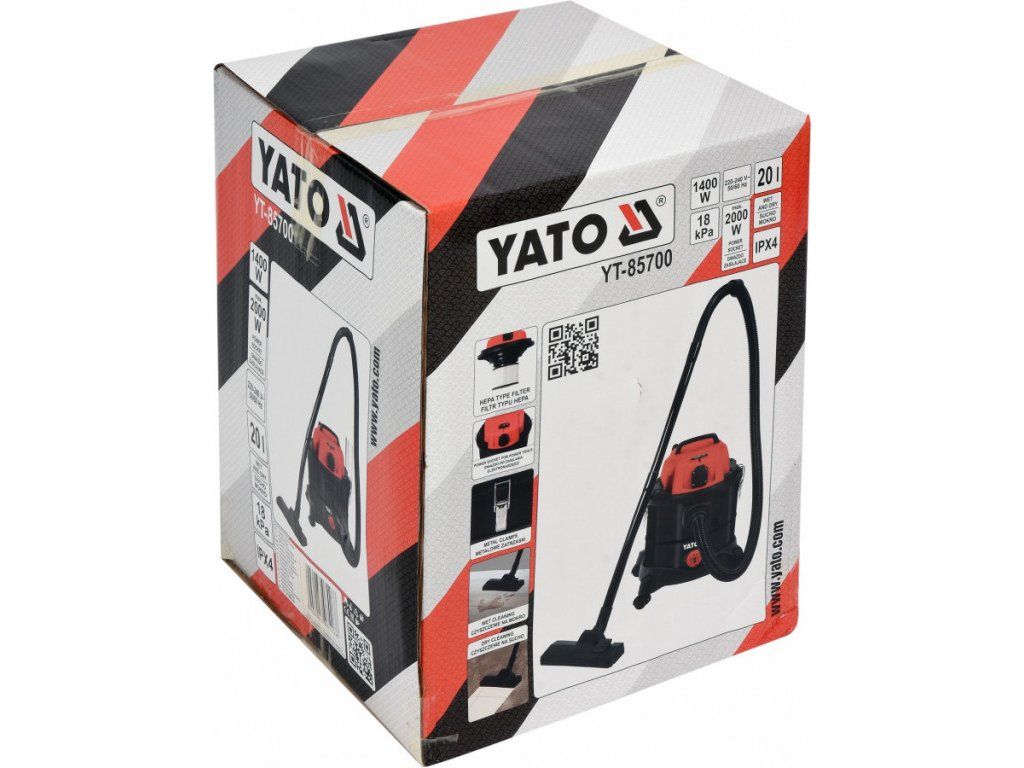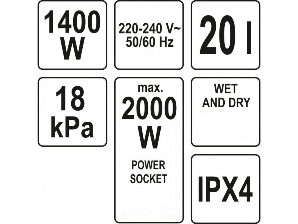 Průmyslový vysavač na suchý i mokrý povrch o výkonu 1400 W. Objem nádoby na prach je 20 l a tlak 18 kPa.