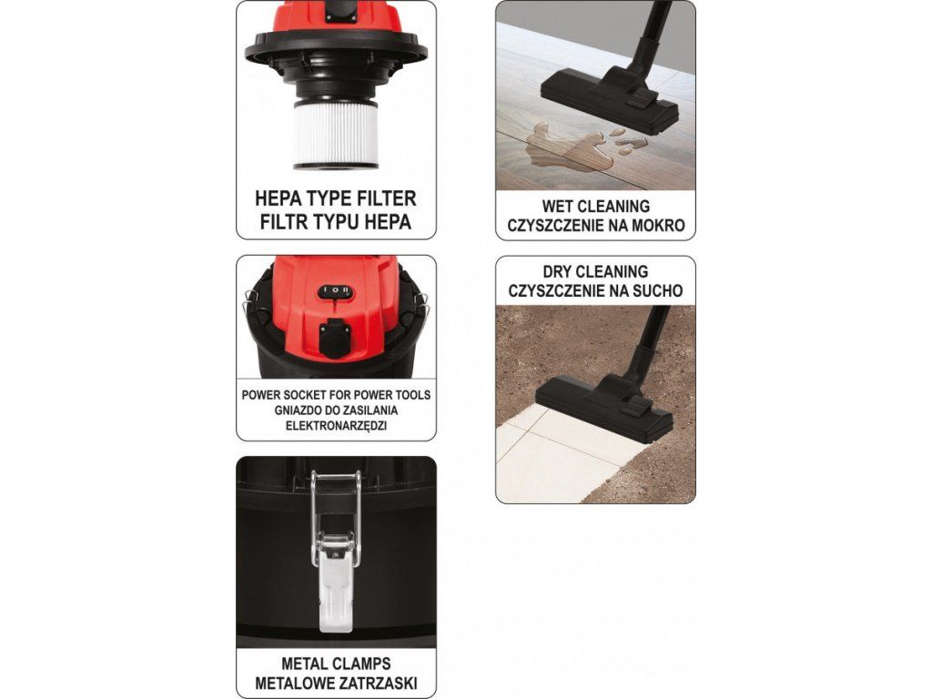 Vysavač je vybaven teleskopickou, antistatickou trubicí a HEPA filtrem. Tělo vysavače je opatřeno vestavěnou zásuvku, která umožňuje napájení dalšího elektrického nářadí. Je možné vysávat s, i bez pytle.