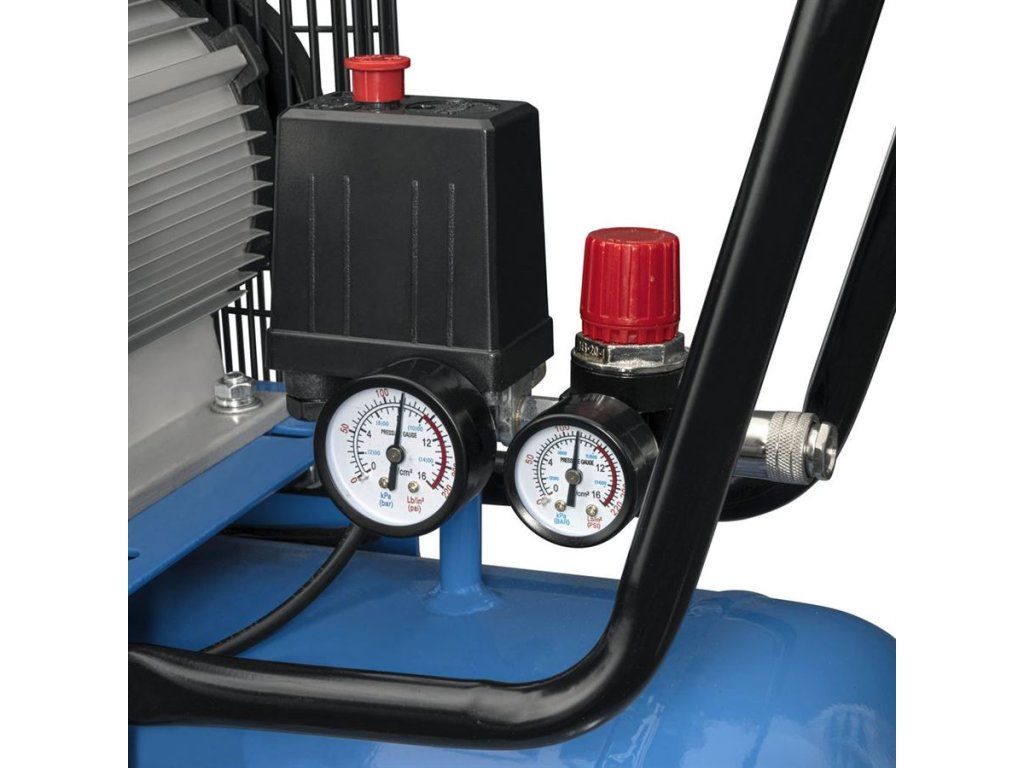 - 2 manometry, 2 výstupy stlačeného vzduchu, tlakový spínač, redukční ventil, pojistný přetlakový ventil, zpětný ventil, olejoznak, 3 vzduchové filtry, jistič motoru, ochranný (mřížový) kryt řemenu.