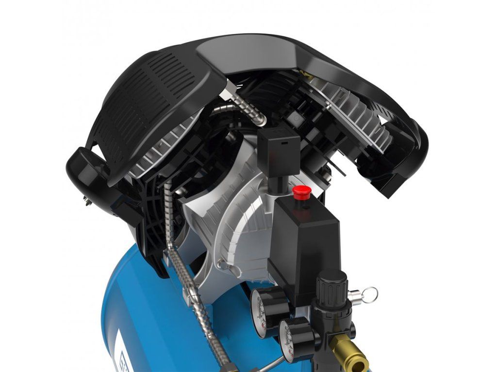 Vybavení: 2 manometry, 2 výstupy stlačeného vzduchu (kovové rychlospojky), tlakový spínač, redukční ventil, pojistný přetlakový ventil, zpětný ventil, olejoznak, 2 vzduchové filtry, 1,8 m síťový kabel H07 RN-F.