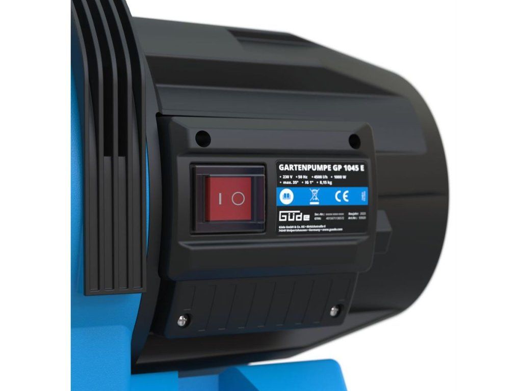 Zahradní čerpadlo užitkové vody, za účelem zavlažování, zalévání, přečerpávání. Výkon 1.000 W, max. výtlačná výška 45 m, max. průtok 4.500 l/hod. Rozměr 375 x 220 x 235 mm, váha 8,15 kg.