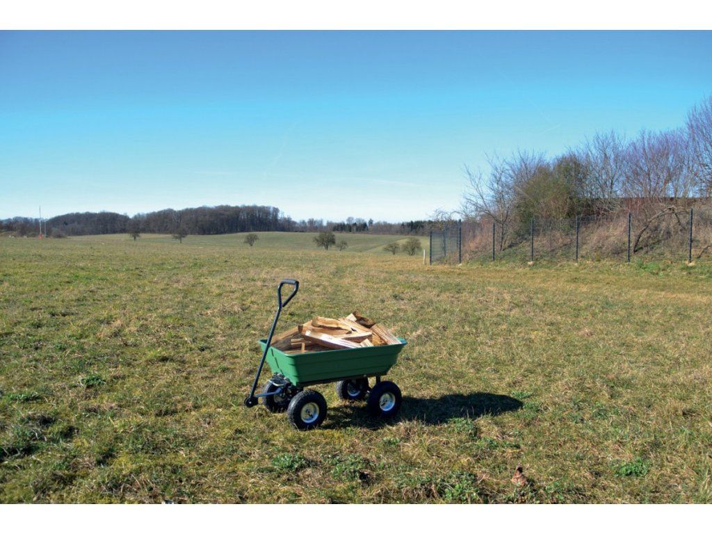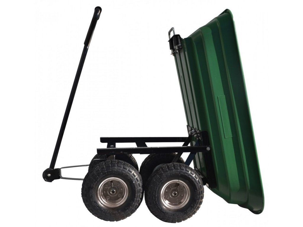 Sklápěcí vozík, vhodný pro přepravu sena, trávy, zahradních odpadů, dřeva, zeminy apod., stabilní ocelový podvozek, 2 nápravy. Vyklápěcí korba z tvrzeného plastu, objem 75 l, nosnost 250 kg.