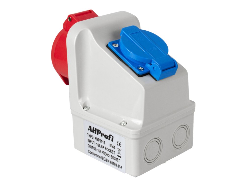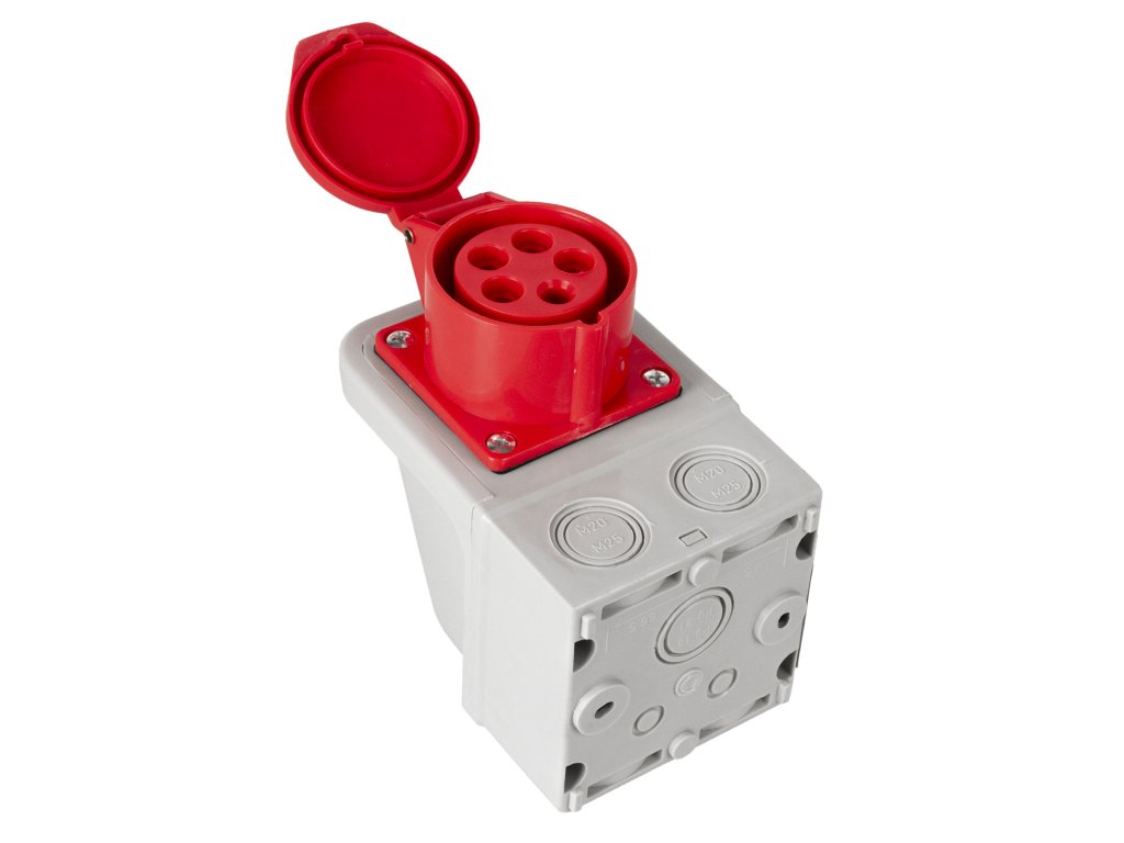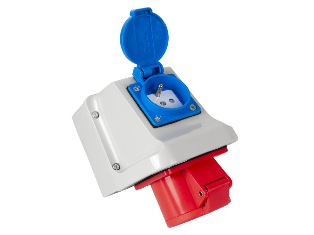 Průmyslová nástěnná zásuvka se vstupem 380 V 16 A 5P a výstupem 1x 380 V a 1x 230 V.