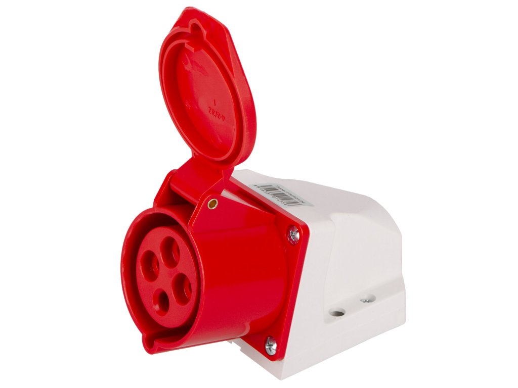 Průmyslová zásuvka na třífázový proud 380 V vhodná pro umístění na zeď.