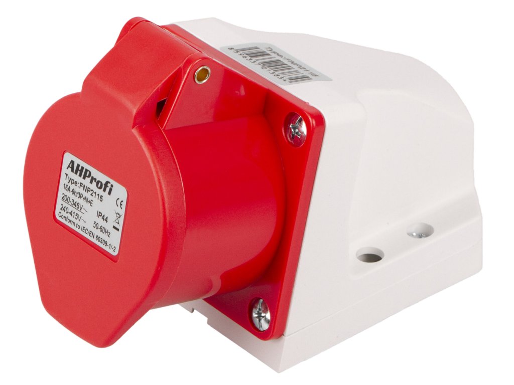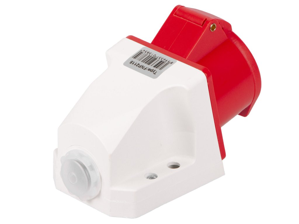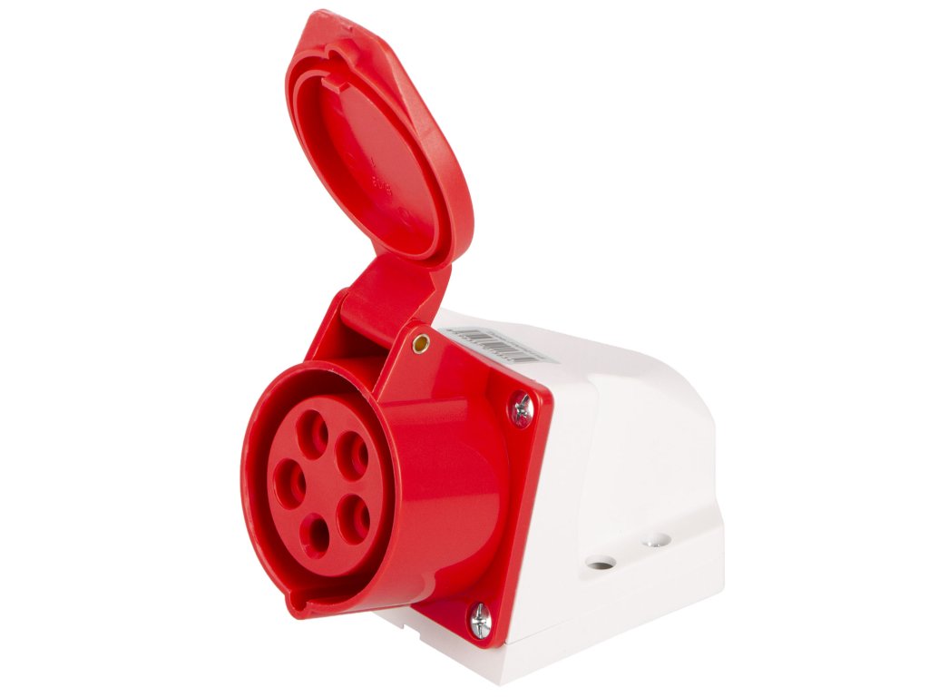 Průmyslová zásuvka na třífázový proud 380 V vhodná pro umístění na zeď.