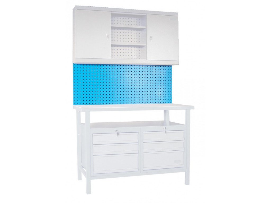 Čtvercové děrování (→ 10 mm2), vzdálenost jednotlivých otvorů: 38 mm. Rozměry 1200 x 460 x 20mm (ŠxVxH). Konstrukce: ocelová deska, 2 zpevňující výztuže na zadní straně.