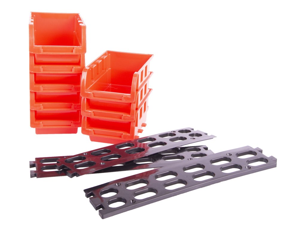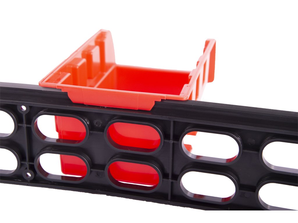 Sada organizéru na šroubky a spojový materiál obsahuje 3 ks plastových vodících lišt, které se dají přišroubovat na zeď, skříň, pojízdný vozík apod.