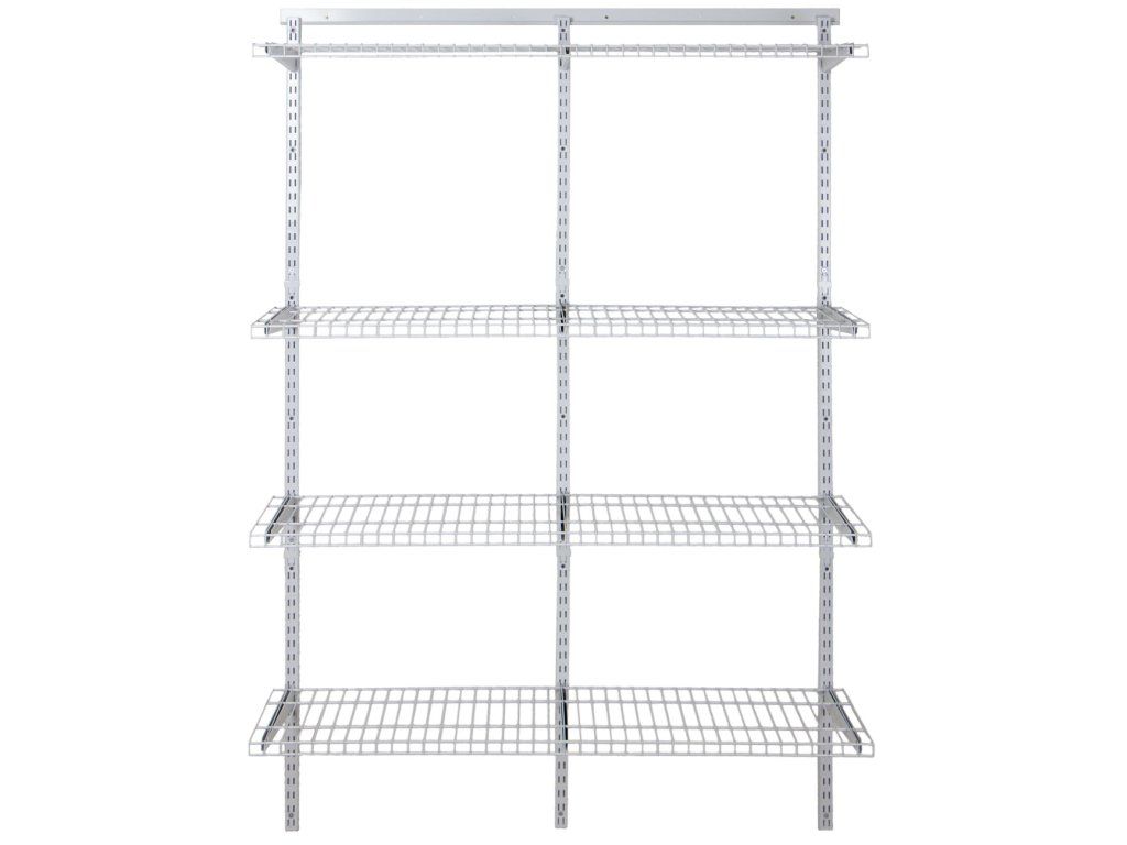 Drátěný policový regál, závěsný na stěnu, 4 dlouhé police, celkový rozměr 1200 x 300 x 1800 mm.