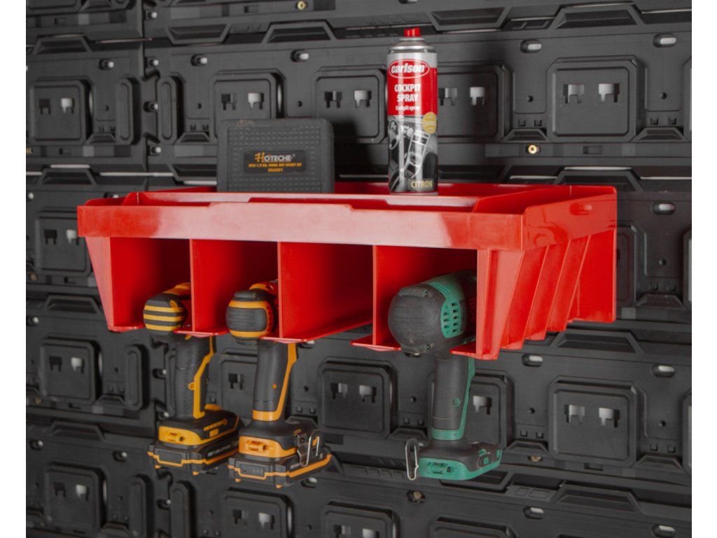 Držák na pneumatické a AKU nářadí je perfektním doplňkem k závěsné desce MW7000. Obsahuje 4 boxy, do kterých přehledně umístíte např. AKU vrtačku, šroubovák nebo pneumatický utahovák. Instalujte snadno kamkoliv do závěsného systému.