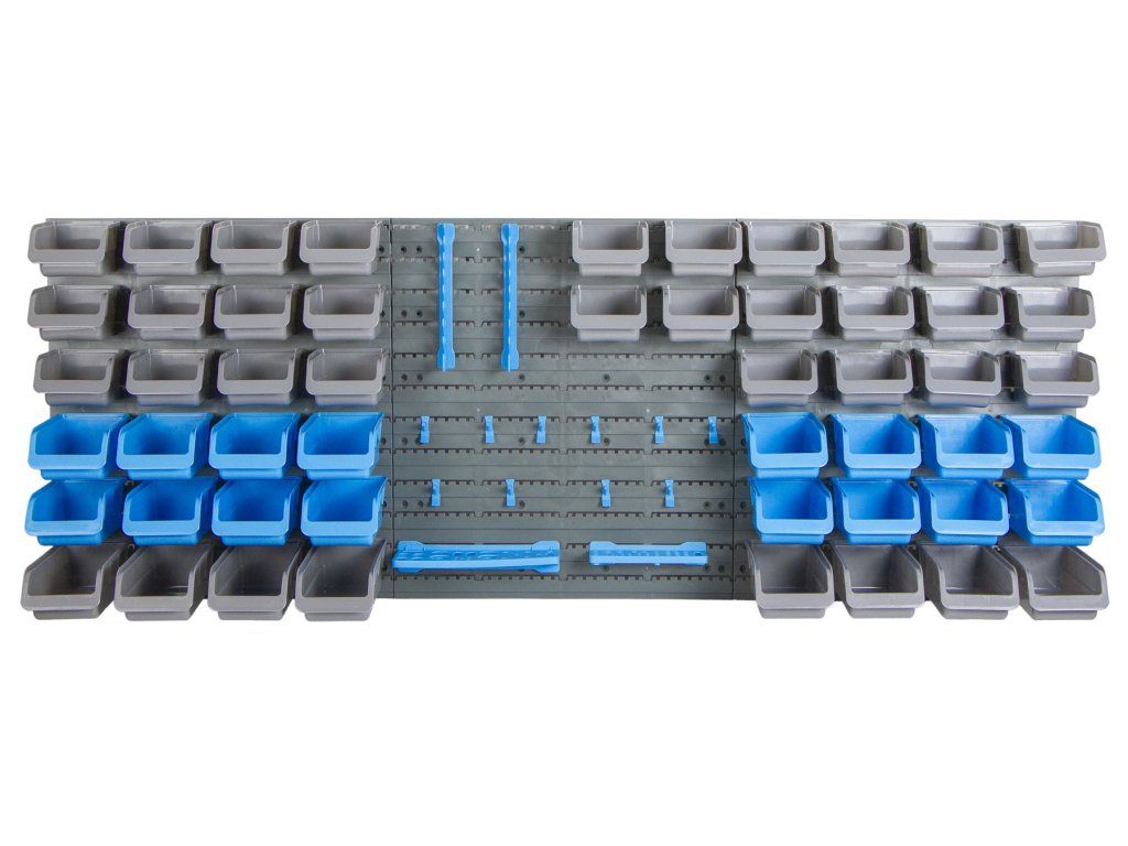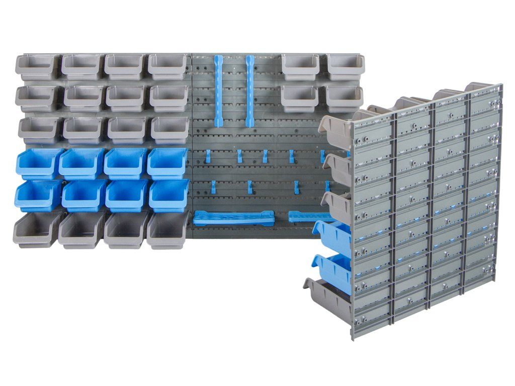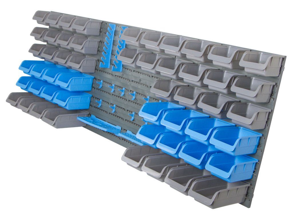 Materiál plast, 3 panely, 52 boxů, háčky, držáky klíčů, šroubováků a vrtáků.