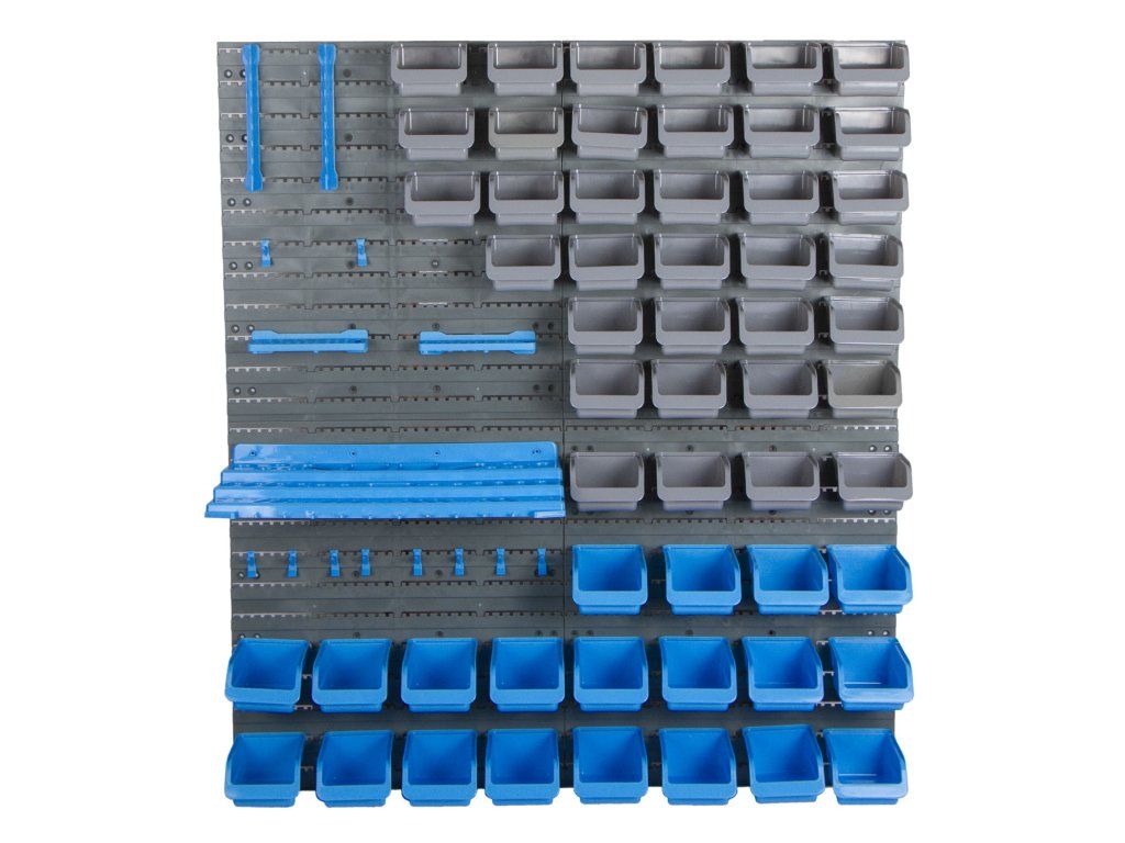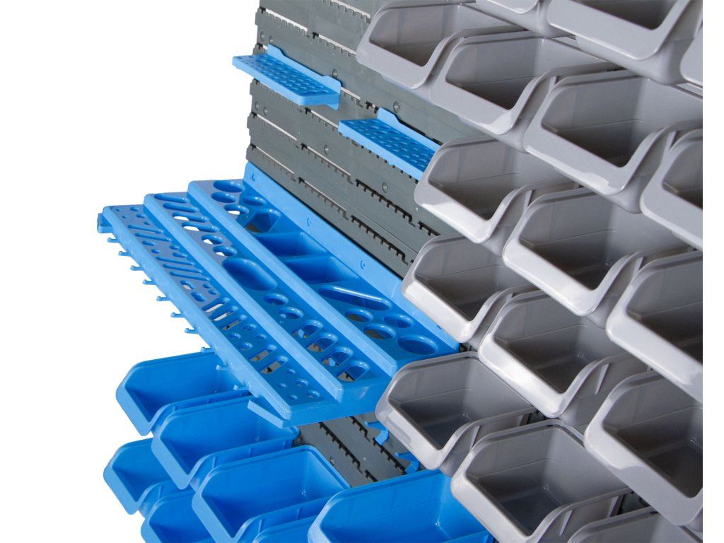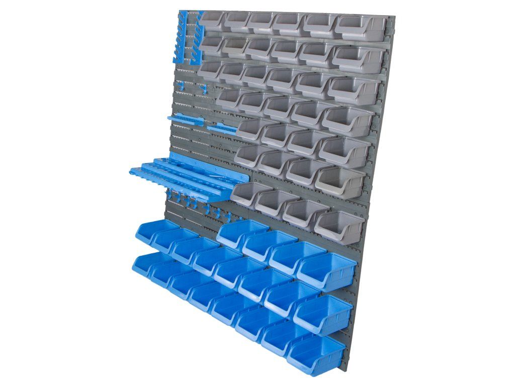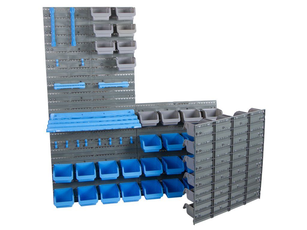 Materiál plast, 4 panely, 55 boxů, háčky, držáky klíčů, šroubováků a vrtáků.