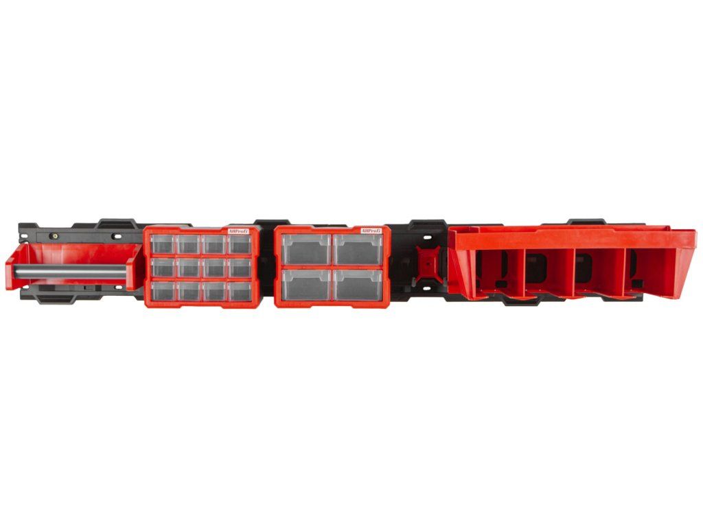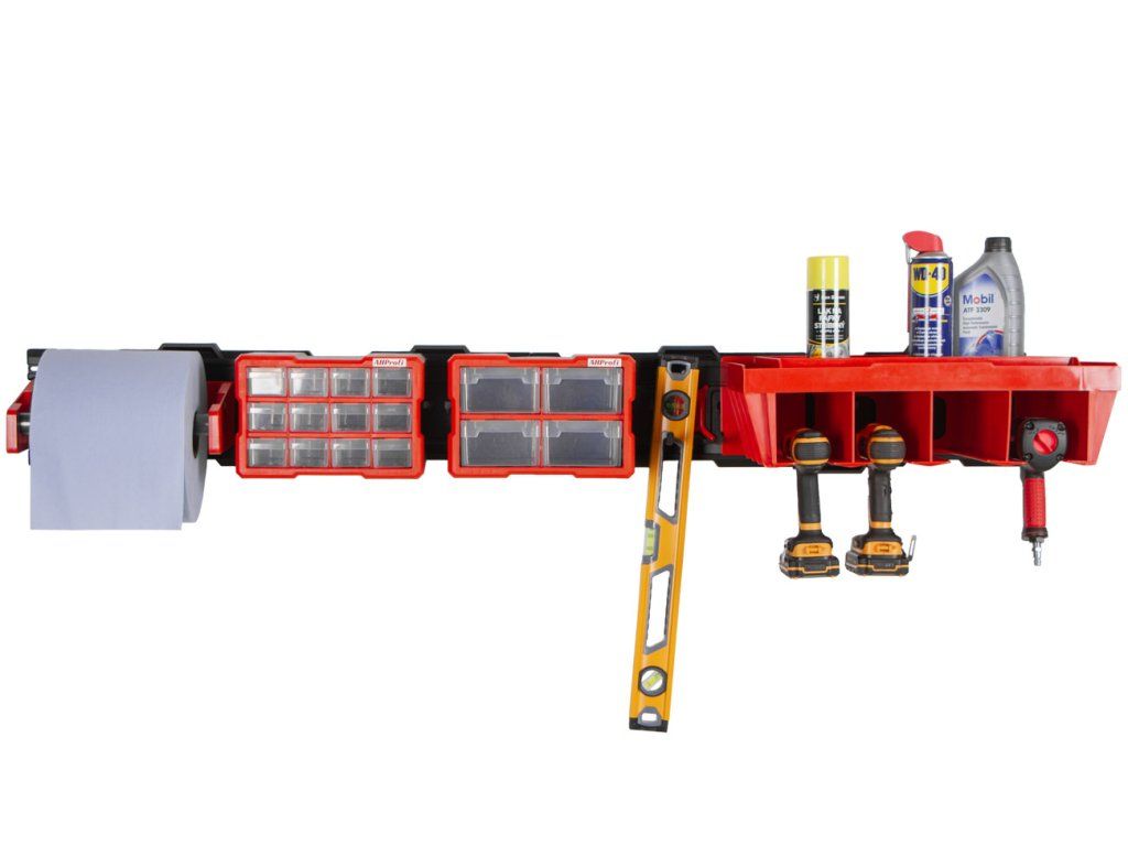 Závěsný systém do dílny, 2 odolné desky z polyamidu, rozměr desky 79,5 x 19 cm, 2 organizéry, 1 držák aku nářadí, držák papírových utěrek, krátký dvojitý hák. Nosnost háku 25 kg.